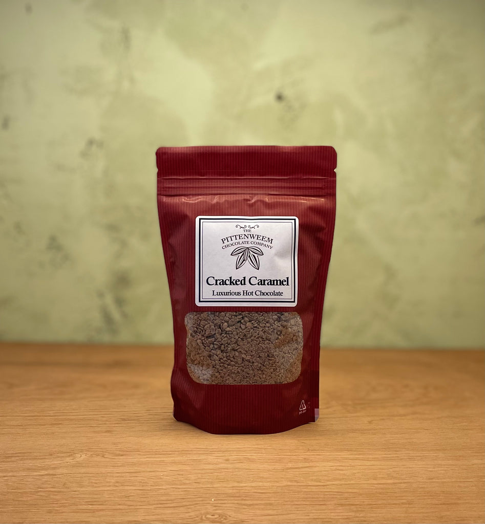 Luxurious Cracked Caramel hot chocolate, handmade by the Pittenweem Chocolate Co.