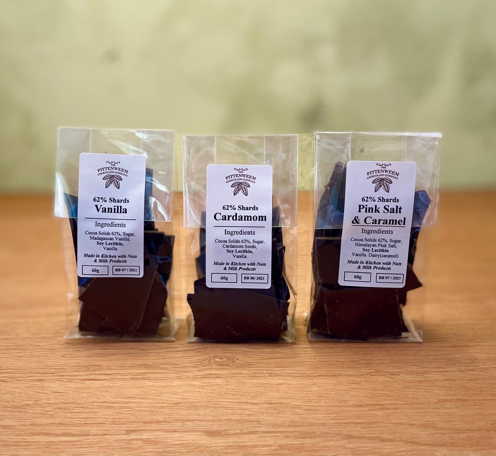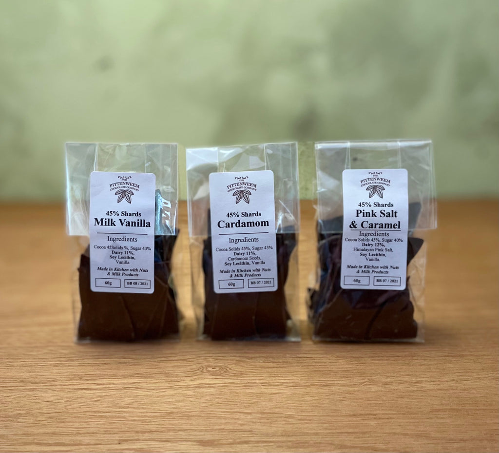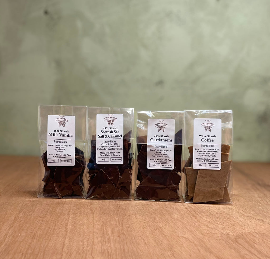 Our indulgent, flavoured chocolate shards – handmade in a range of flavours by the Pittenweem Chocolate Co.