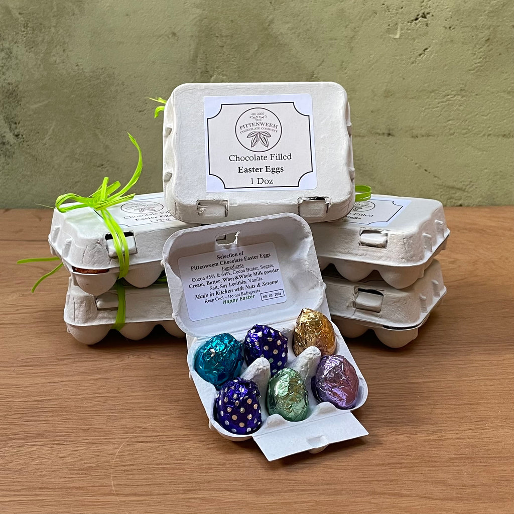 A wee assorted selection of our handmade filled and solid eggs. Available in either a 1/2 dozen box or a Dozen.